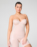 Our strapless mid-thigh bodysuit provides all-over compression to shape and support your figure. With fit-flexible and lightly padded cups that serve as your bra. removeable and 5-way convertible straps that eliminate rolling and folding. and free-cut hems that don't squeeze or dig. this will be your go-to. versatile bodysuit for those very specific silhouettes that require very specific shapewear. Crafted from lightweight and cling-free fabric that prevents thigh chafing. it's perfect for all-night wear.